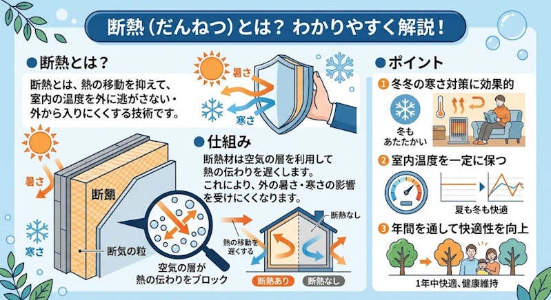 断熱とは、熱の移動を抑えて、室内の温度を外に逃がさない・外から入りにくくする技術です。