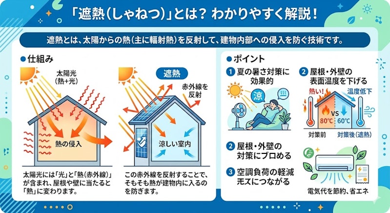遮熱とは、太陽からの熱(主に輻射熱)を反射して建物内部への侵入を防ぐ技術です。