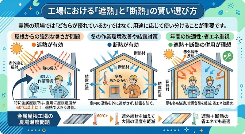 特に金属屋根の工場では、夏場に屋根温度が60℃以上になることもあり、遮熱対策の有無で作業環境が大きく変わるケースが多いです。