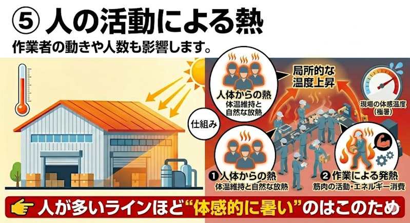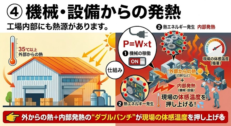 👉外からの熱+内部発熱の“ダブルパンチ”が現場の体感温度を押し上げる