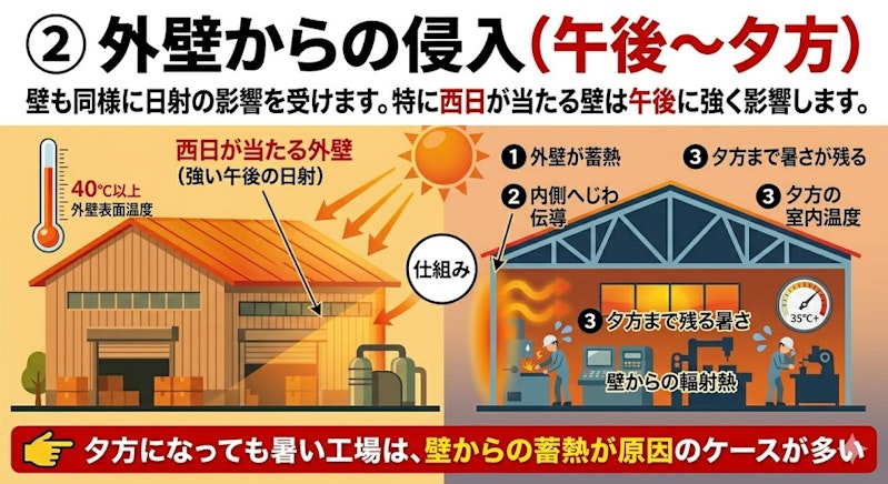 👉 夕方になっても暑い工場は、壁からの蓄熱が原因のケースが多い
